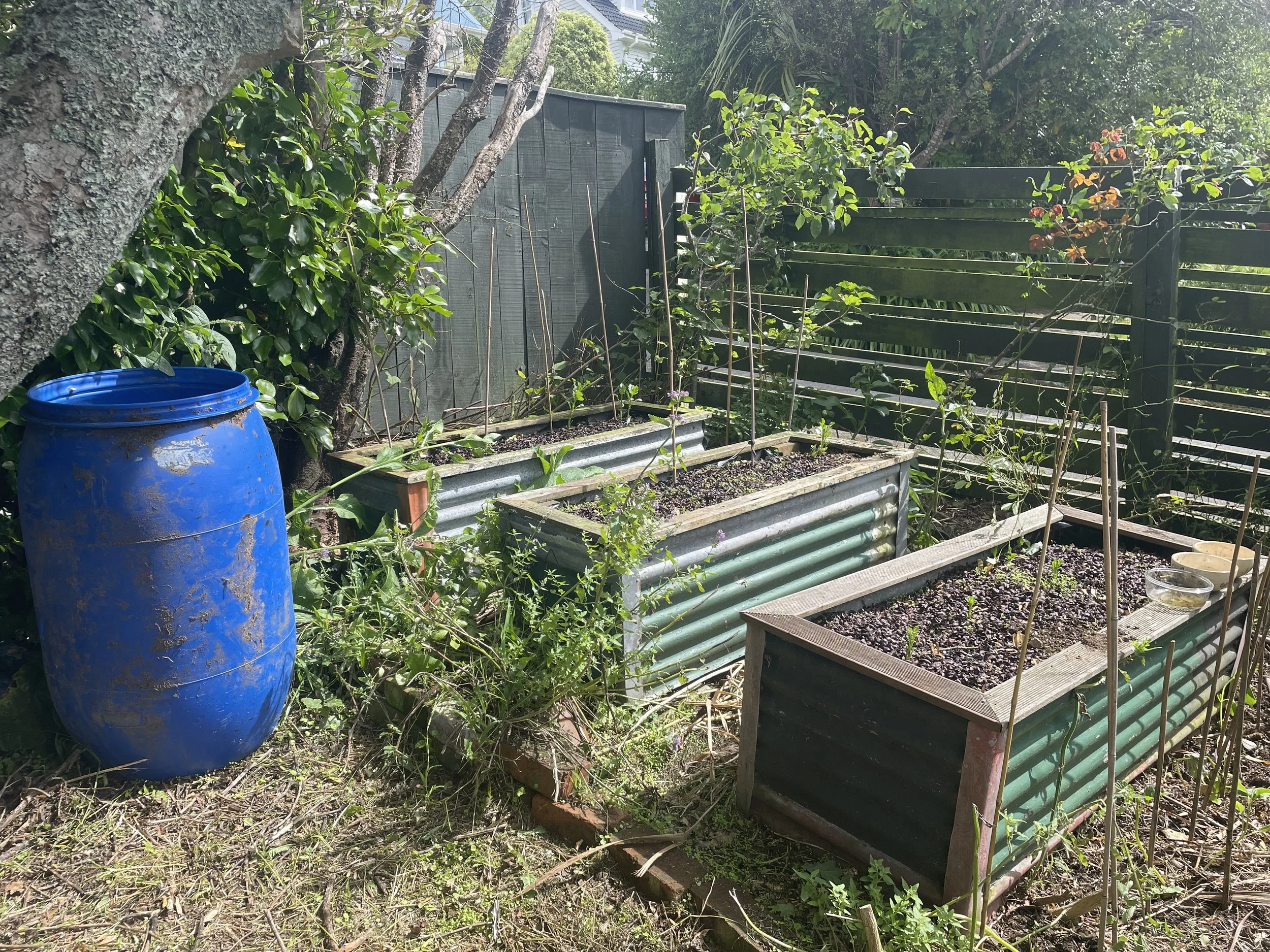 The western corner of the back garden and a wonderful water tank from my friend Margaret.