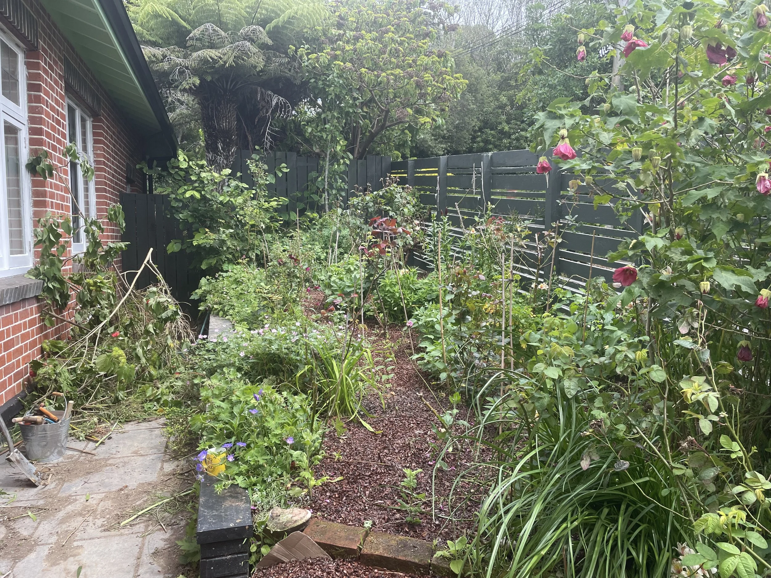 The side garden after I’ve weeded, pruned, fed and mulched.