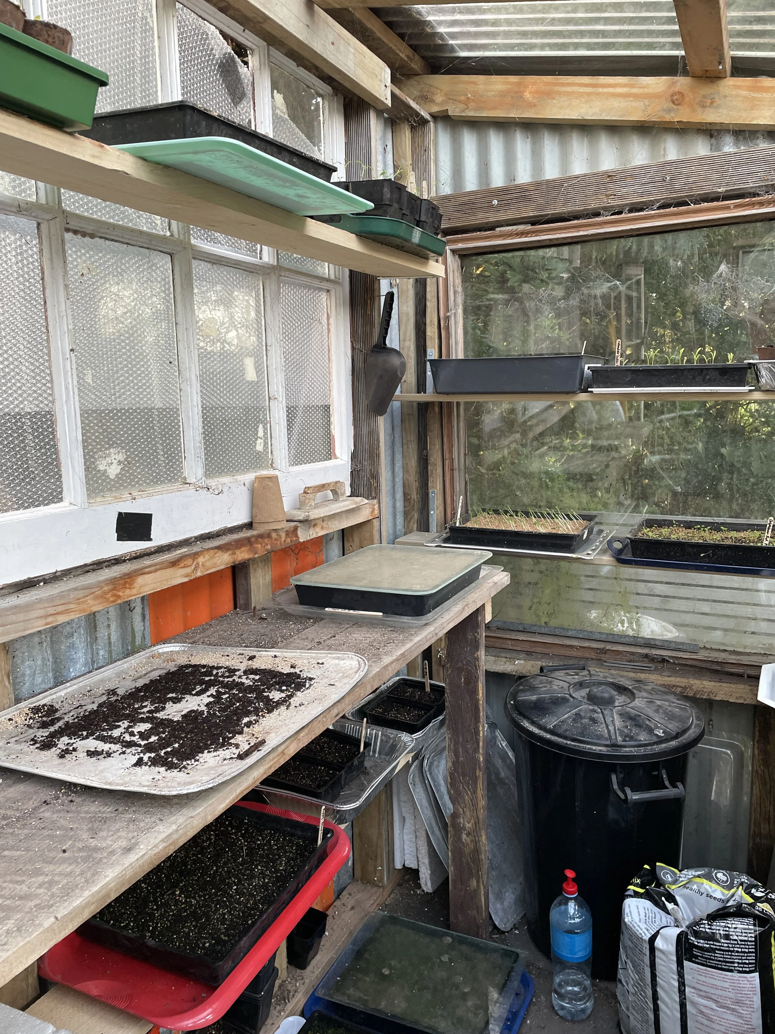 The new shelves I built in the greenhouse (not the big one, but all the ones around it).