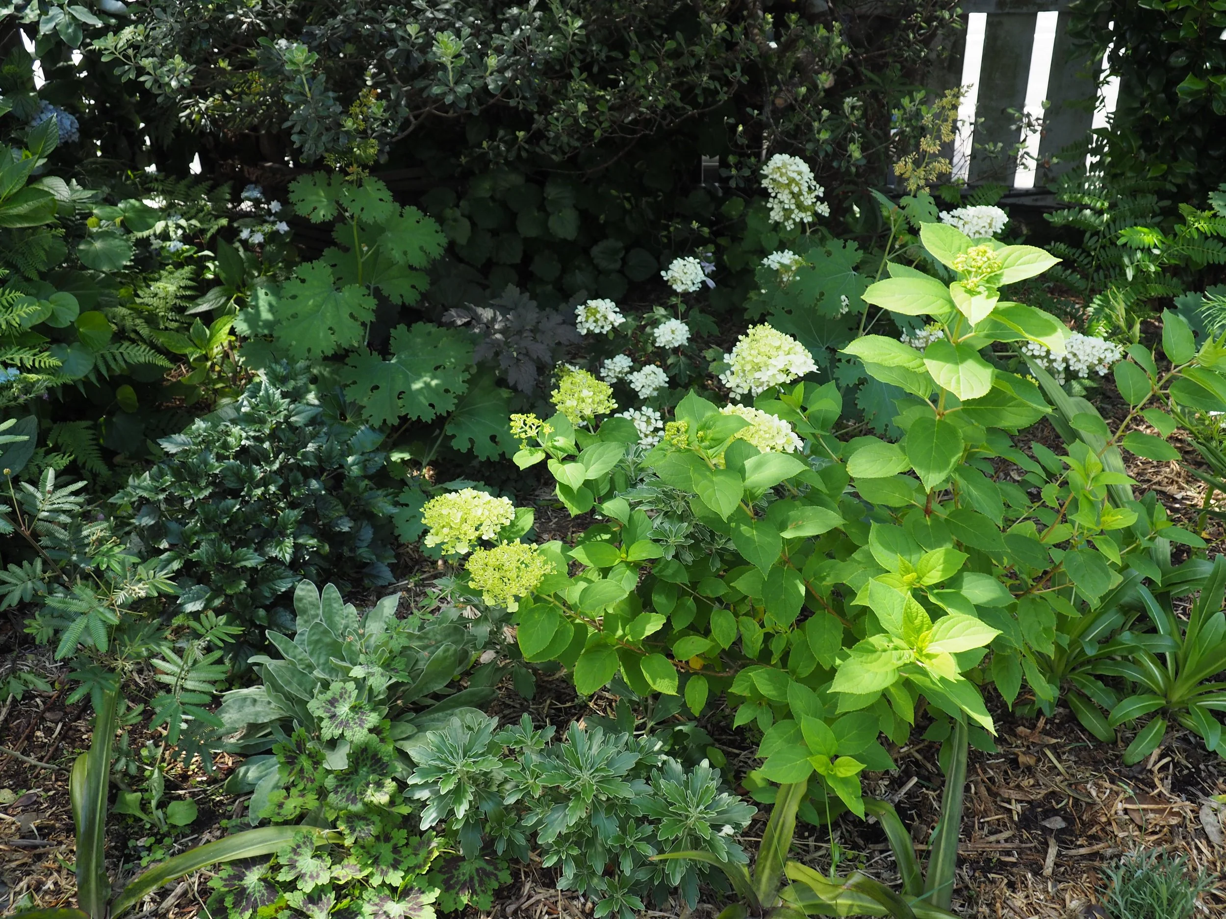 The plants with the big green leaves and tufty flowers are plume poppies, which I bought at a garden fair. The white flowers are Hydrangea Quercifolia ‘Pee Wee’.