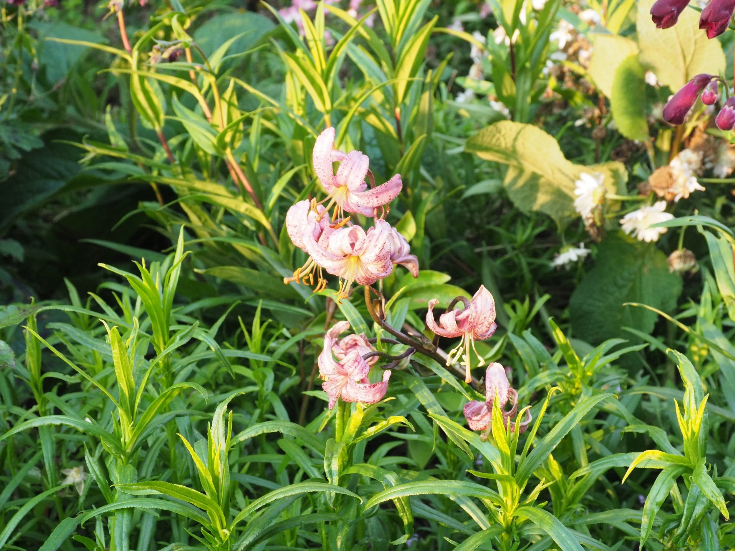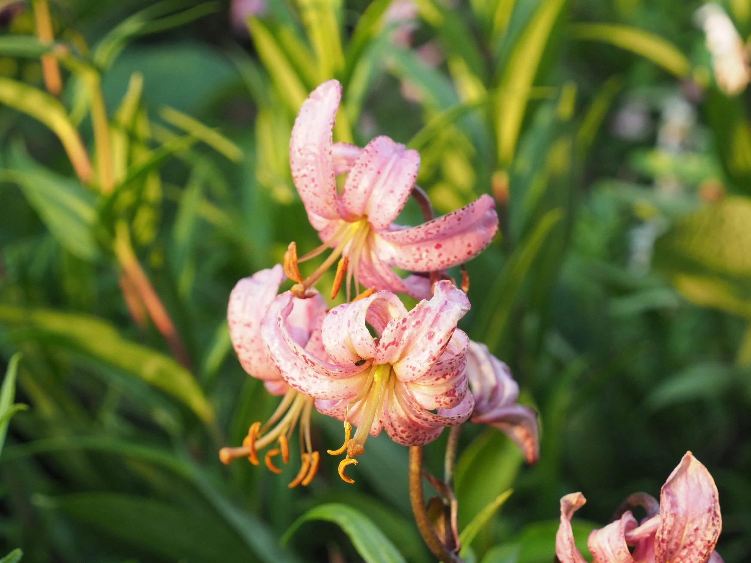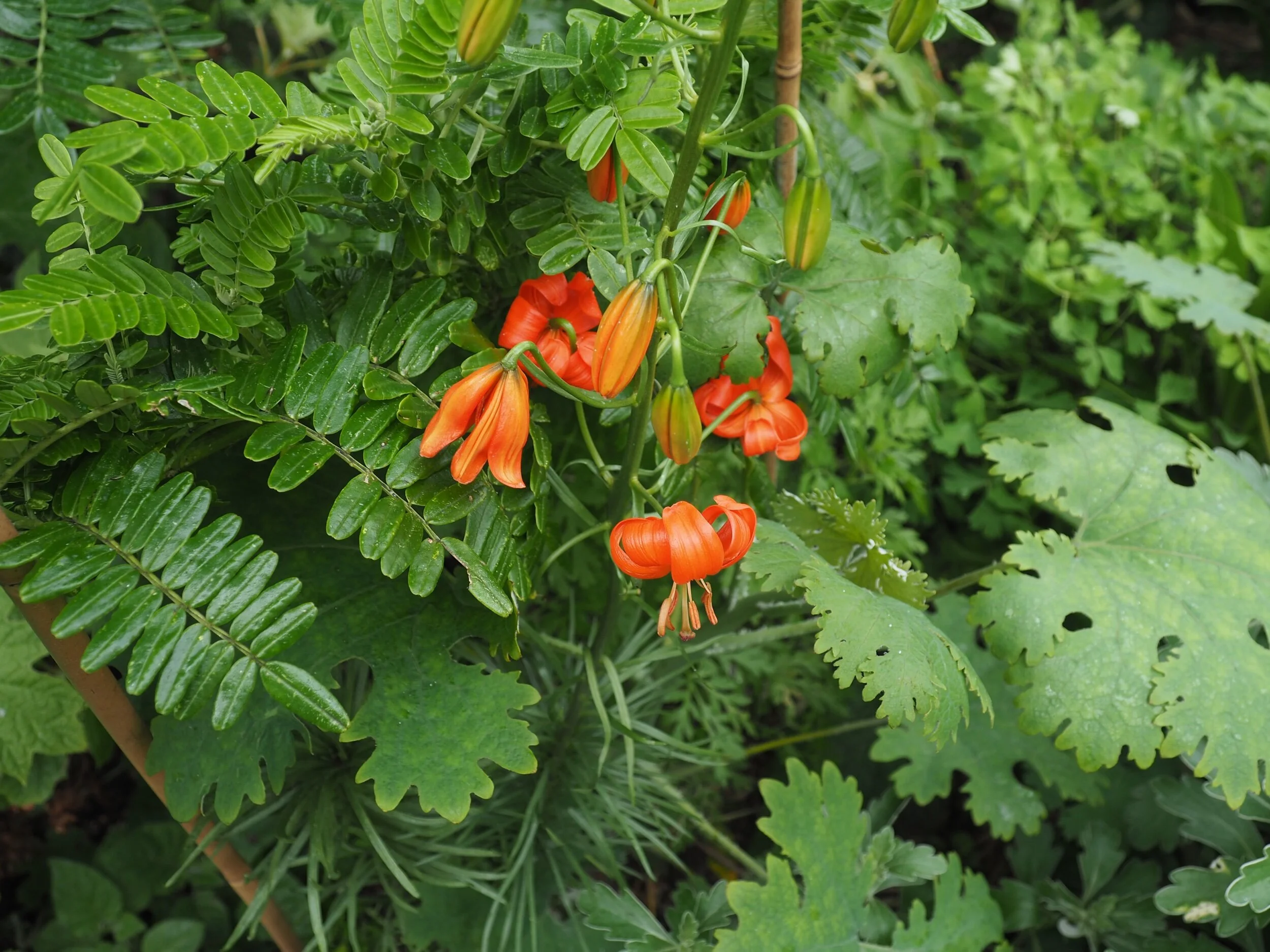 This year I discovered small upside-down lilies. The pink one is Lilium martagon and the orange one is Lilium pumilum, which is shade tolerant and has wonderful grass-like leaves.