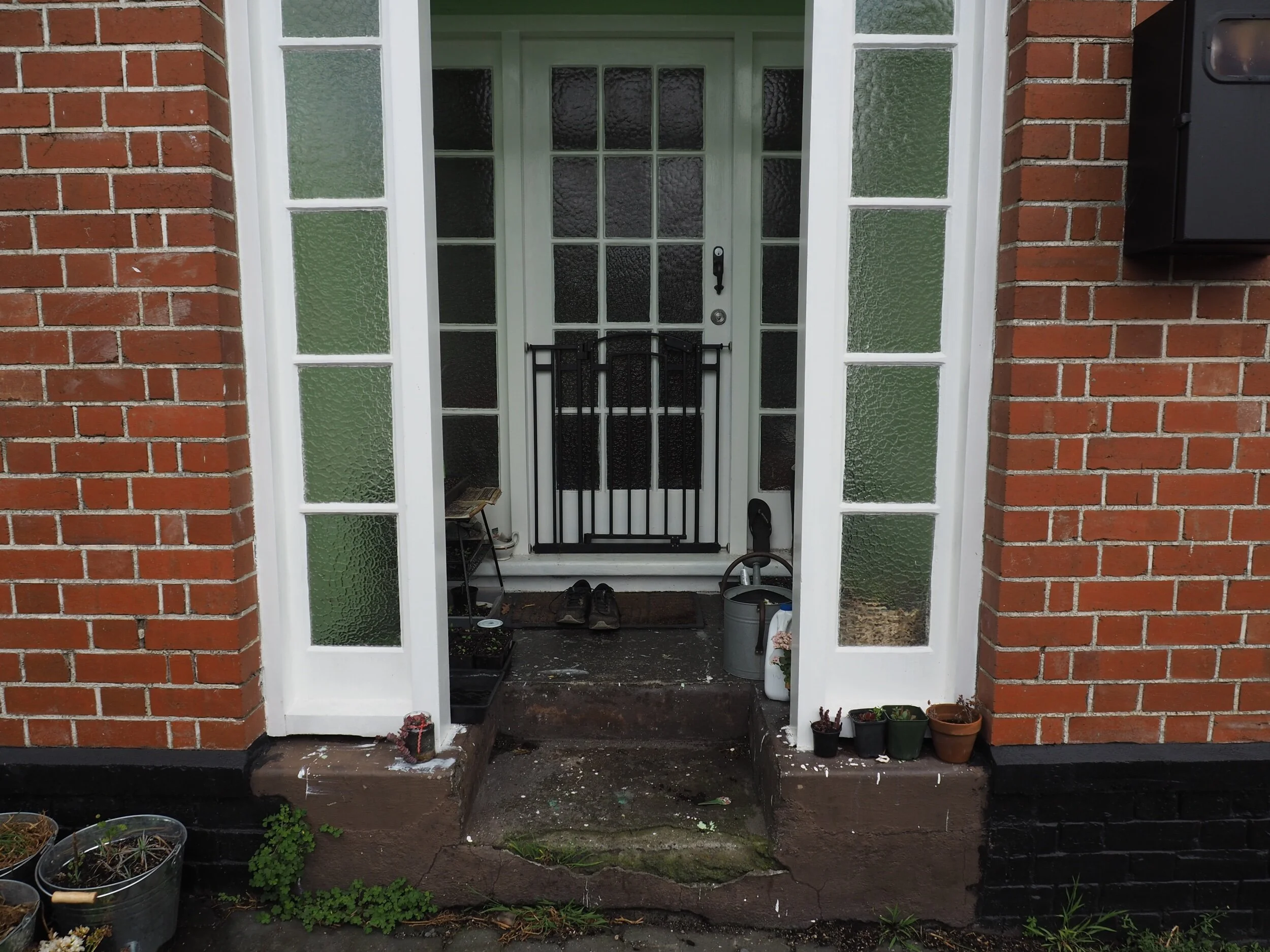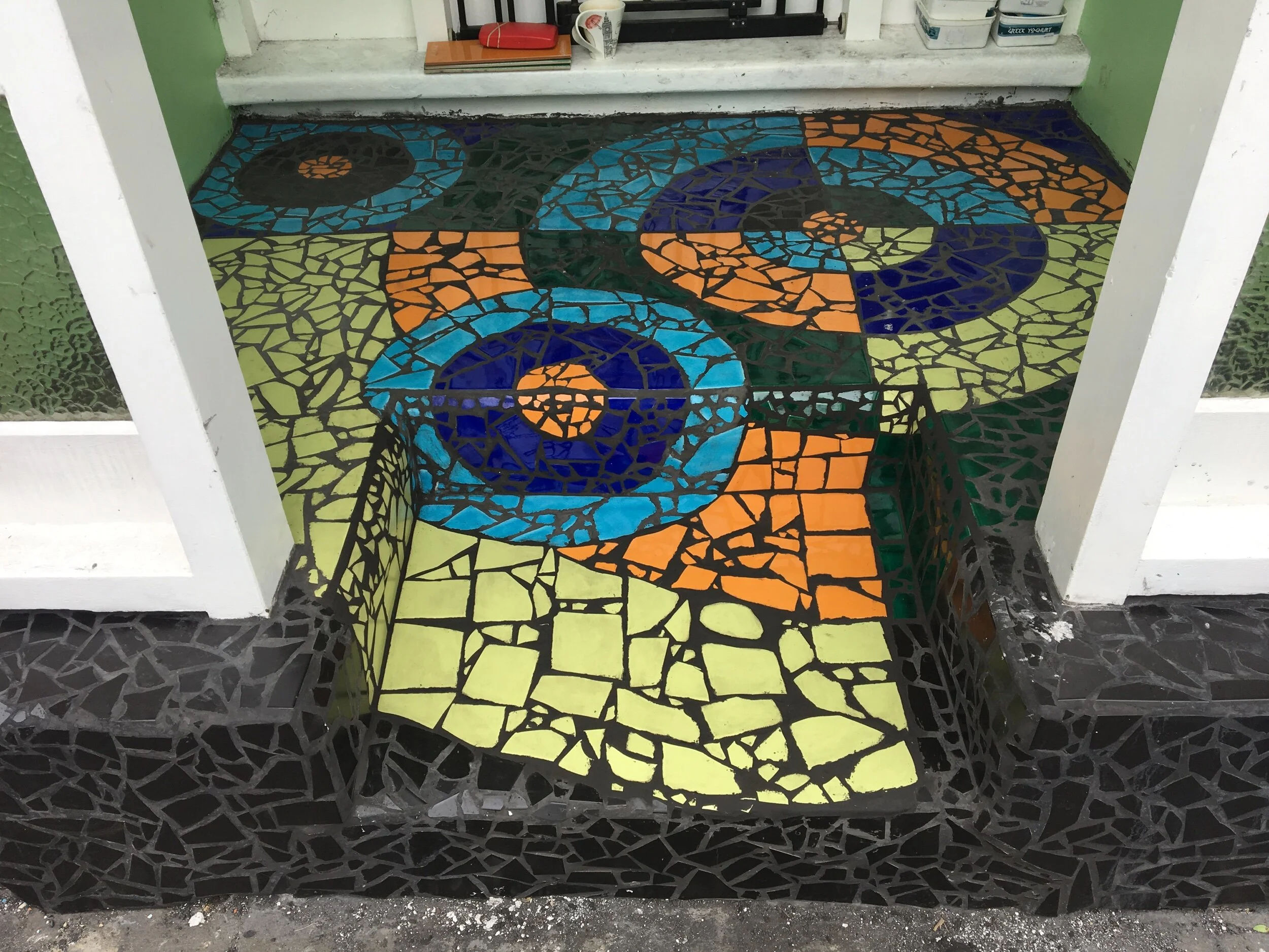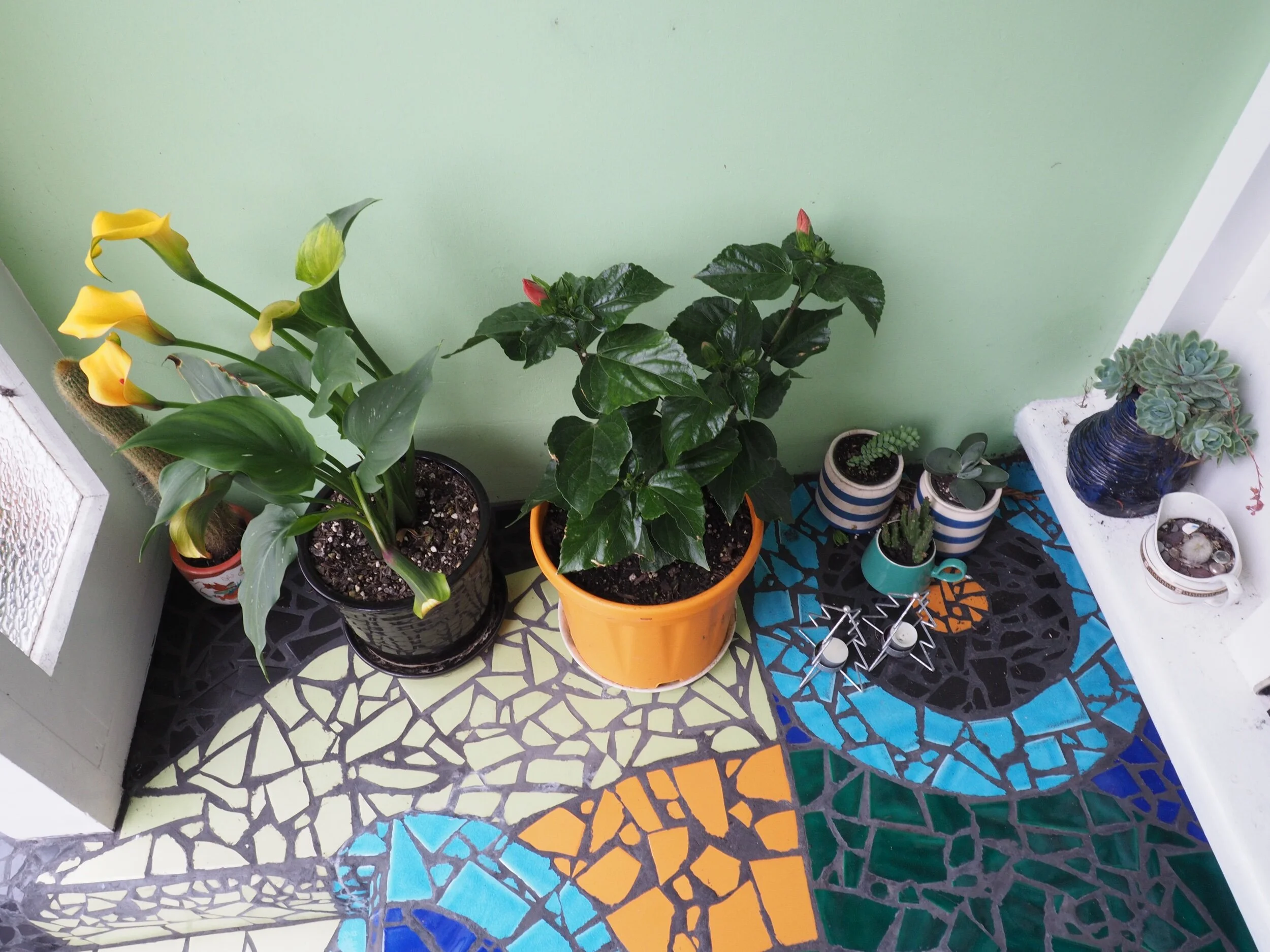 In the photograph above you can see how the front steps looked before I tiled them, pretty bloody ugly. My friend Cheryl, who’s a folk artist and an expert at mosaicking, taught me the craft of tiling. We started on the hardest part, the front of the bottom step, which had broken concrete (so we had to do lots of bogging), lots of weeds and it was vertical (working against gravity). Cheryl started me off and then went to Australia on a holiday. I was on my own.