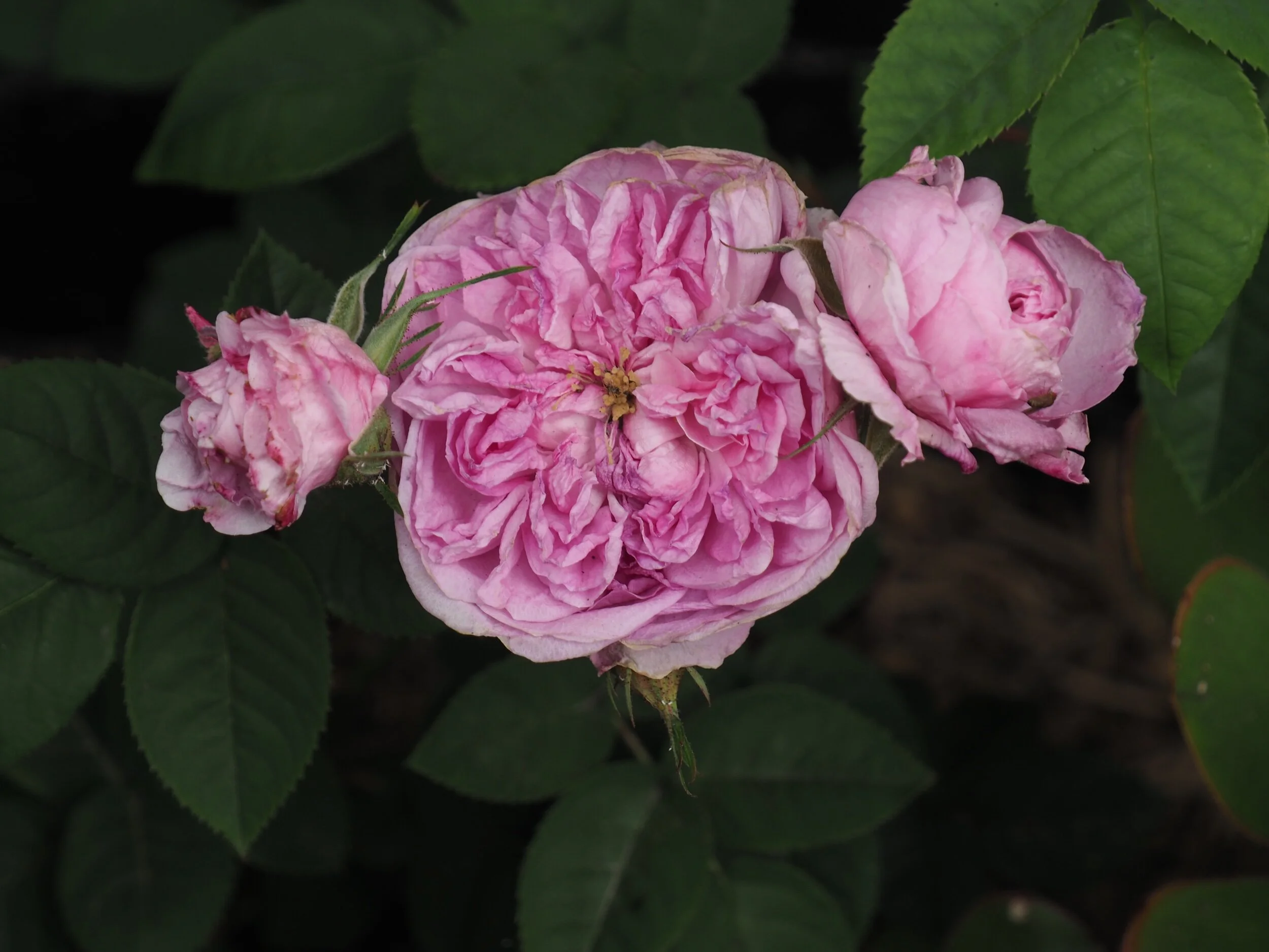 Here are 2 pink roses, one above and one below. The one below is an old rose called de la Grifferaie from 1846. I have two growing in my front garden. The rose above is a cutting of a mystery rose belonging to my friend Ali. The mystery rose looks a lot like de la Grifferaie. I think they’re the same rose. Similar flowers and similar leaves. What do you think?