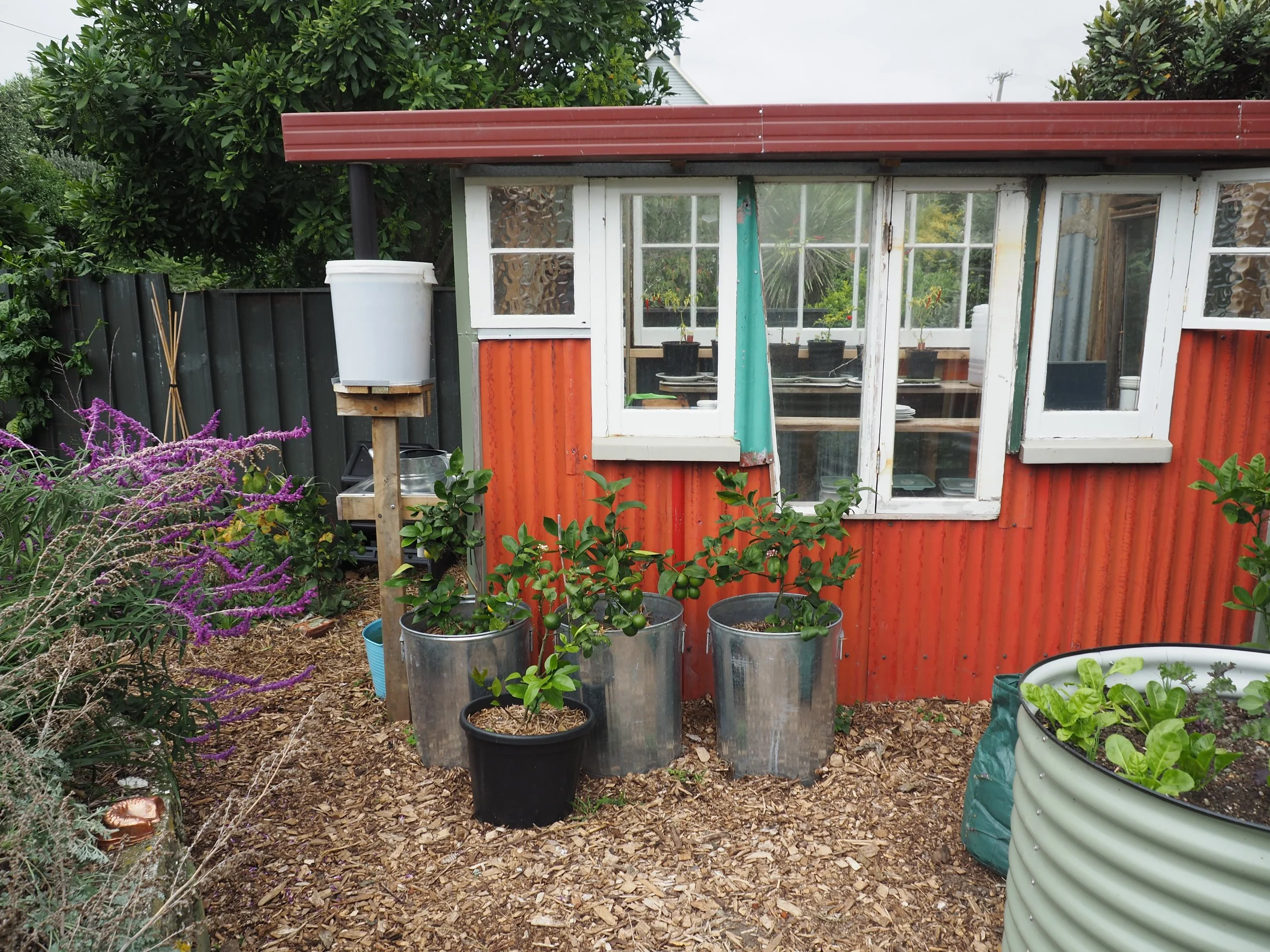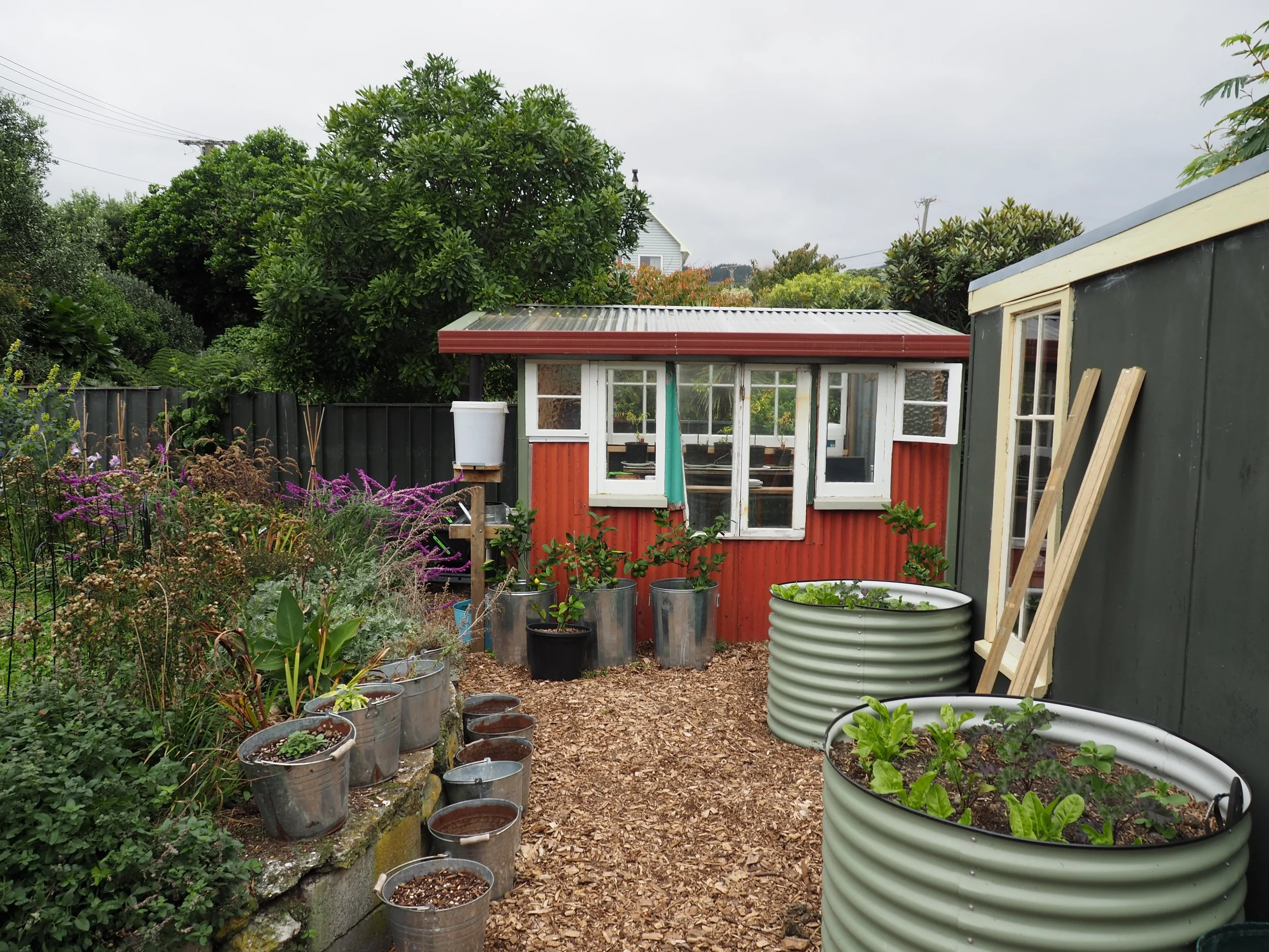Our friend Paul built this glasshouse for me out of recycled materials. So far I’ve only grown chillies in it, which I neglected and yet still grew. It was an oven last summer. So this year, I plan on making some blinds for the ceiling to make it cooler. The soil to the right of the glasshouse is, most likely, contaminated. It’s full of old bits of treated timber and cans and all manner of rubbish. The soil smells sour. For this reason I’m growing all my food crops (in this part of the garden) in raised beds and containers.