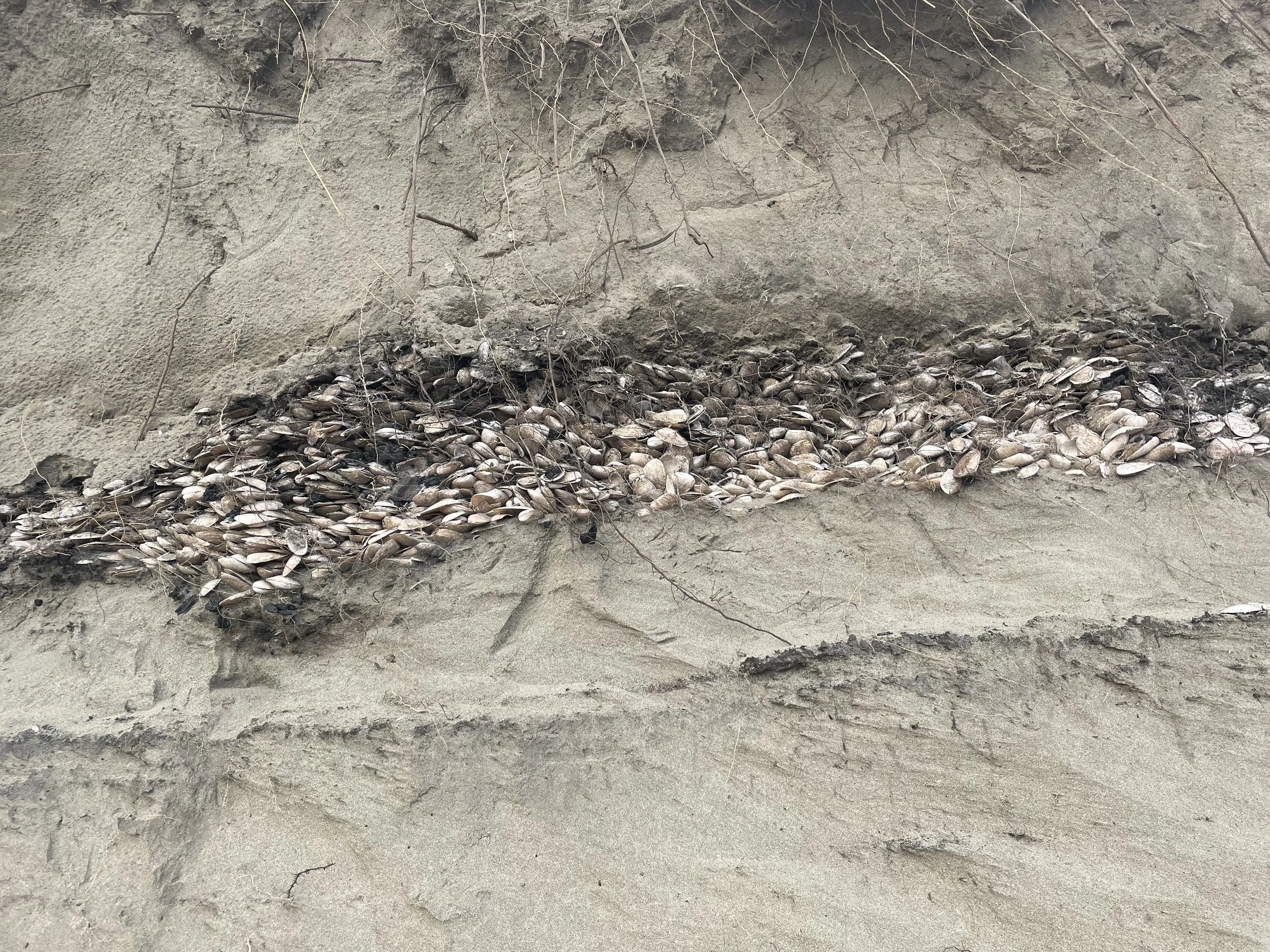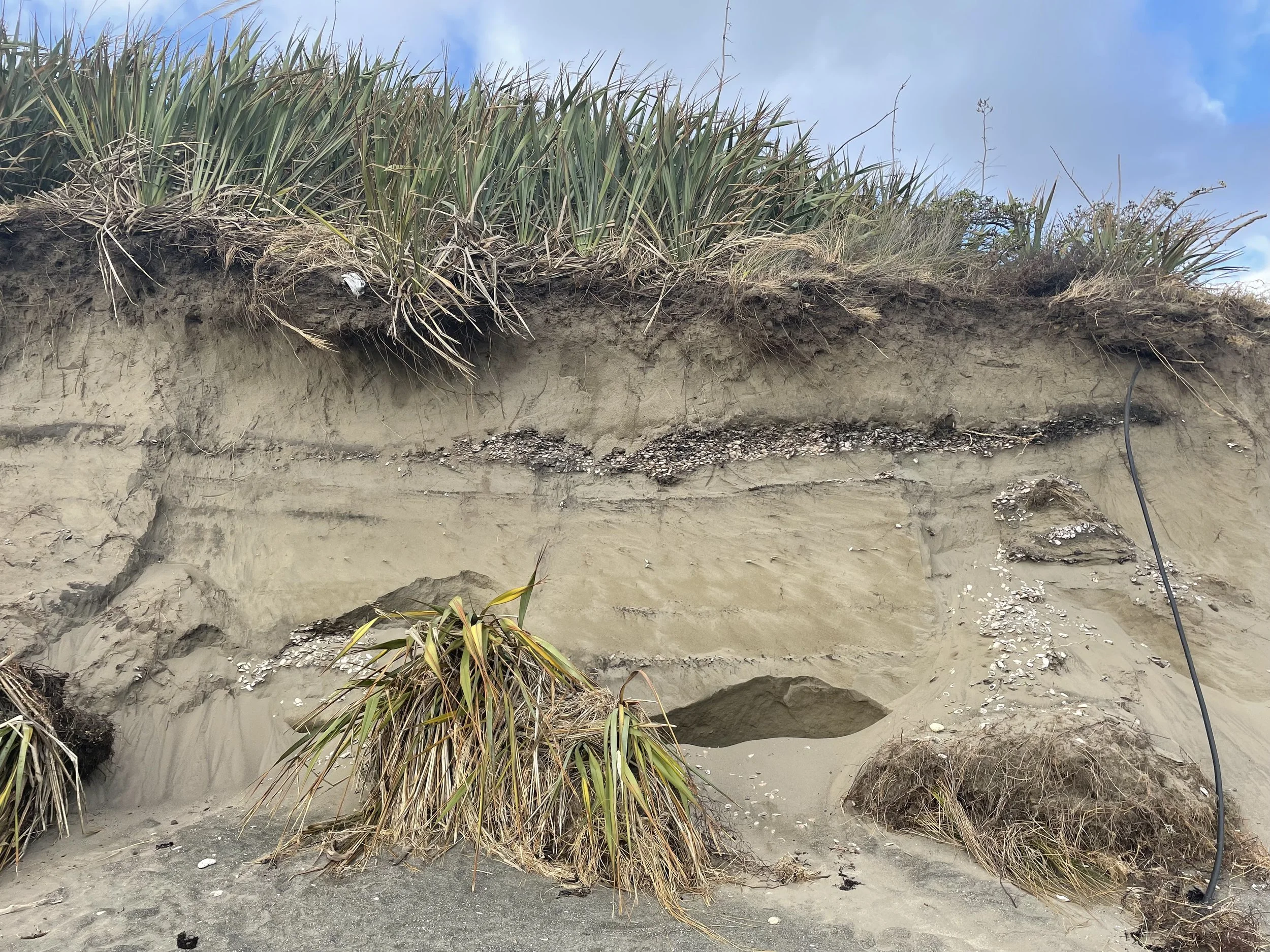 The cross-sections of these sandhills tell an interesting story. At the top you have the plants: flax, grasses, small trees - (Coprosma repens), and weeds. The next big layer is sand and then, in some places, is a layer of white shells, which are middens from the time that early Māori occupied the area, then there’s a lot more sand, and almost at the bottom of the sandhill, but not quite, is a layer of white pumice stones (probably from the Lake Taupo eruption 1,800 years ago).