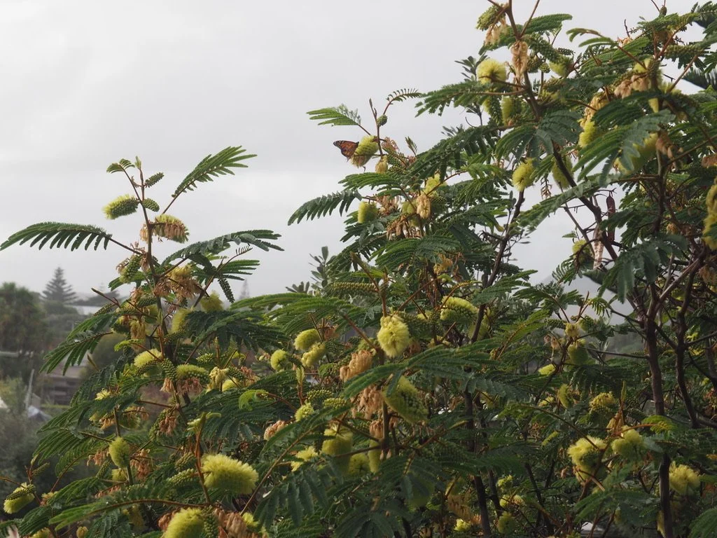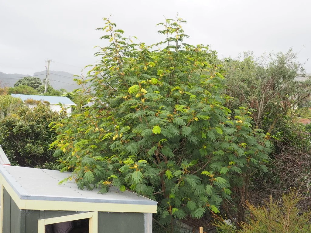 Two years ago we rented a holiday house in Waikanae Beach. There was a wide overgrown verge beside the house where dozens of bush wattles grew. From sunrise to sunset the flowers on these trees were swarming with birds, bees and monarch butterflies. It seemed to me that these bush wattles were providing a community service, keeping a lot of high value animals fed and sheltered.