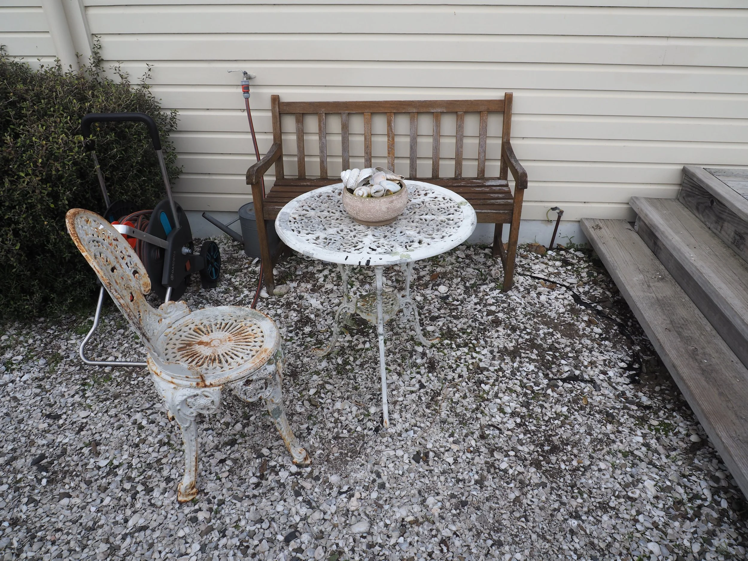 The new garden sits beside this shelly courtyard. The shelly courtyard is looking pretty scruffy and unloved. I wrote about it several blogs back. There’s weed matting under the shells. The weeds are growing through it.