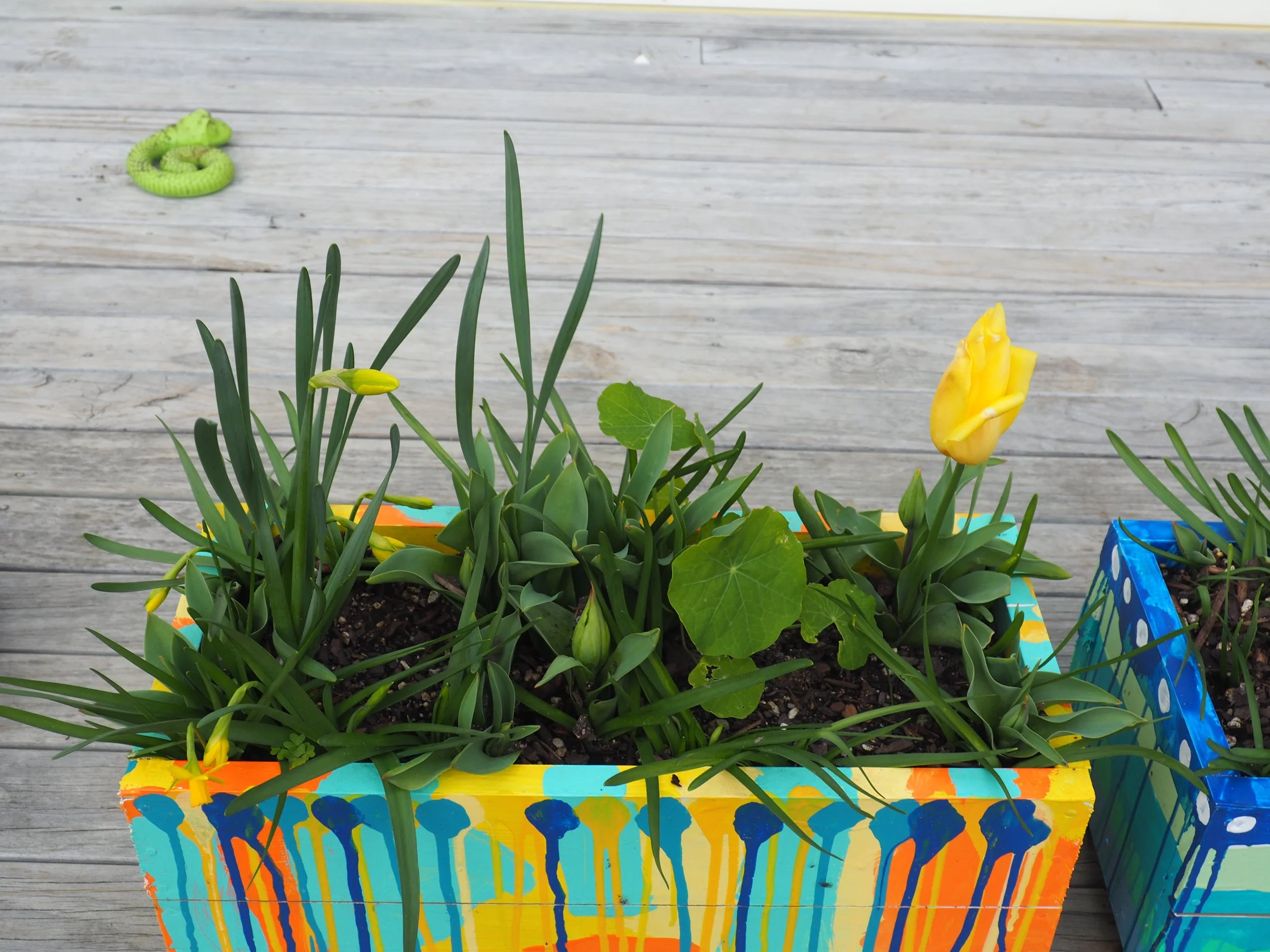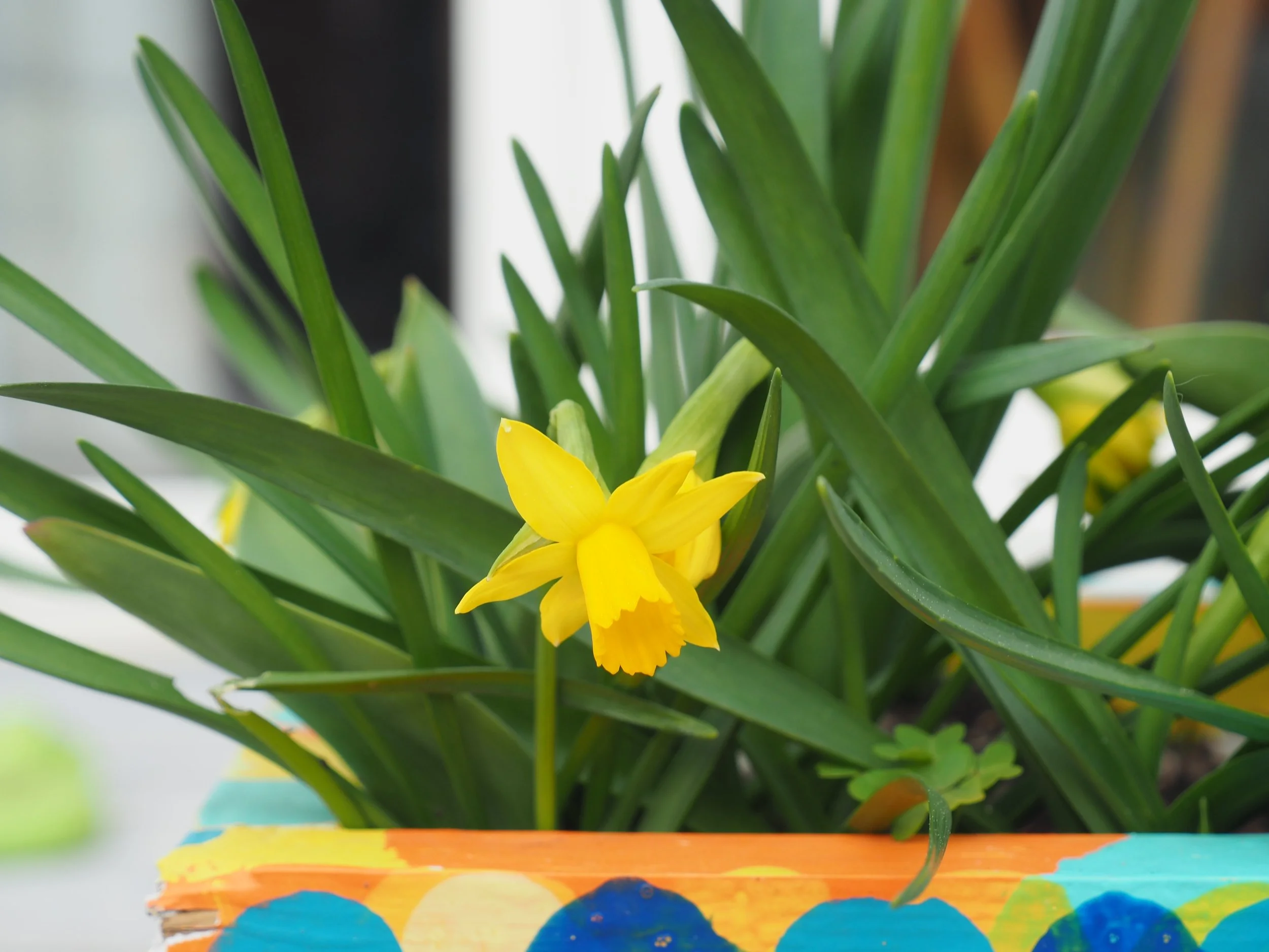 All the bulbs I planted in these containers have come back this year. I wasn’t sure if the tulips would because they can be one minute wonders in containers. But then these are Darwin tulips and they’re tougher than most. I think I planted 2 different daffodils, at least I think I did. The ones flowering are ‘tete a tete’.