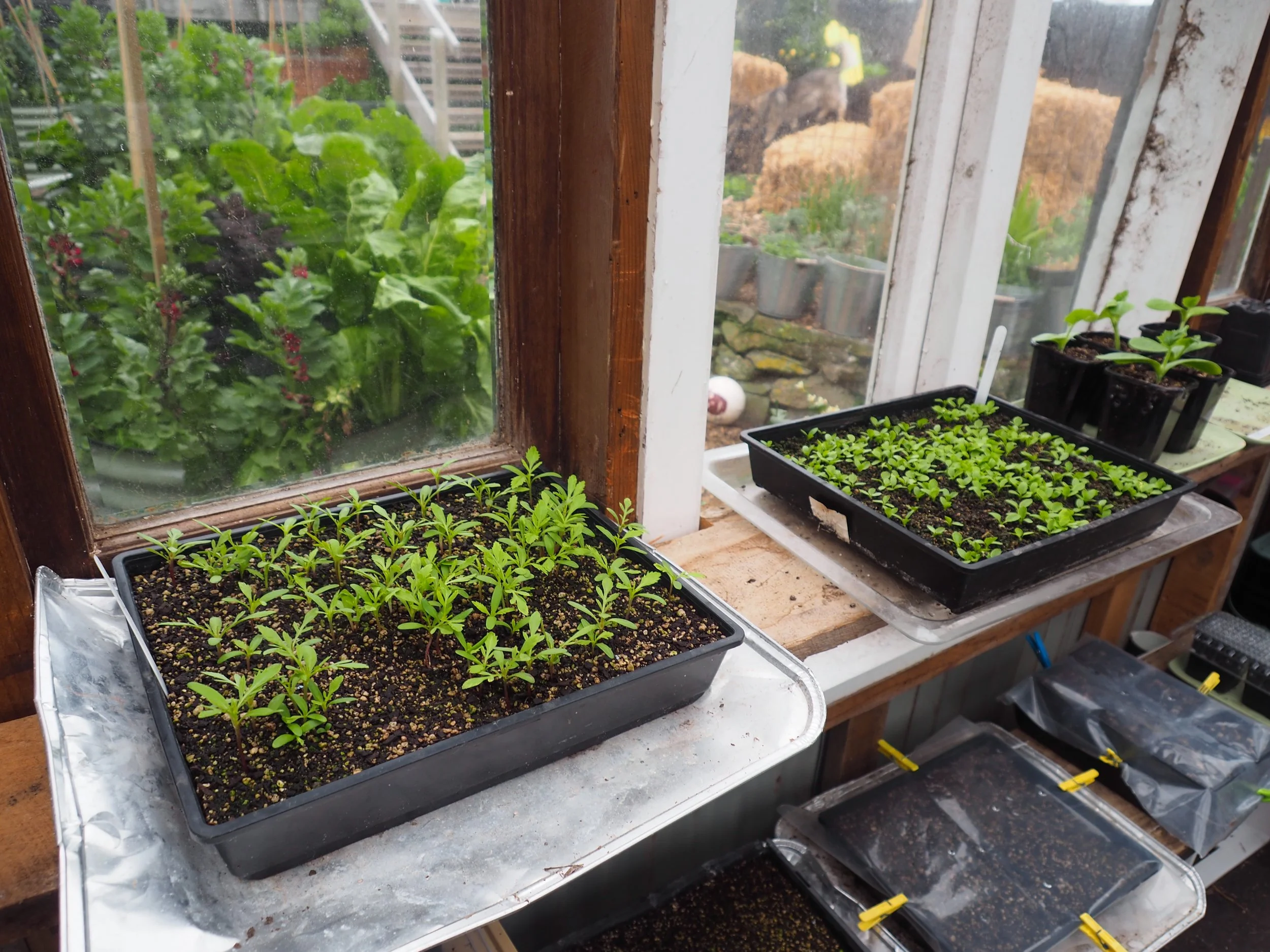 There’s progress in the glasshouse. The tall marigolds and eryngium seedlings are ready to be potted on. I’m still waiting for beans, cucumber, coriander and swan plants to show their faces (It’s Just A Matter Of Time).