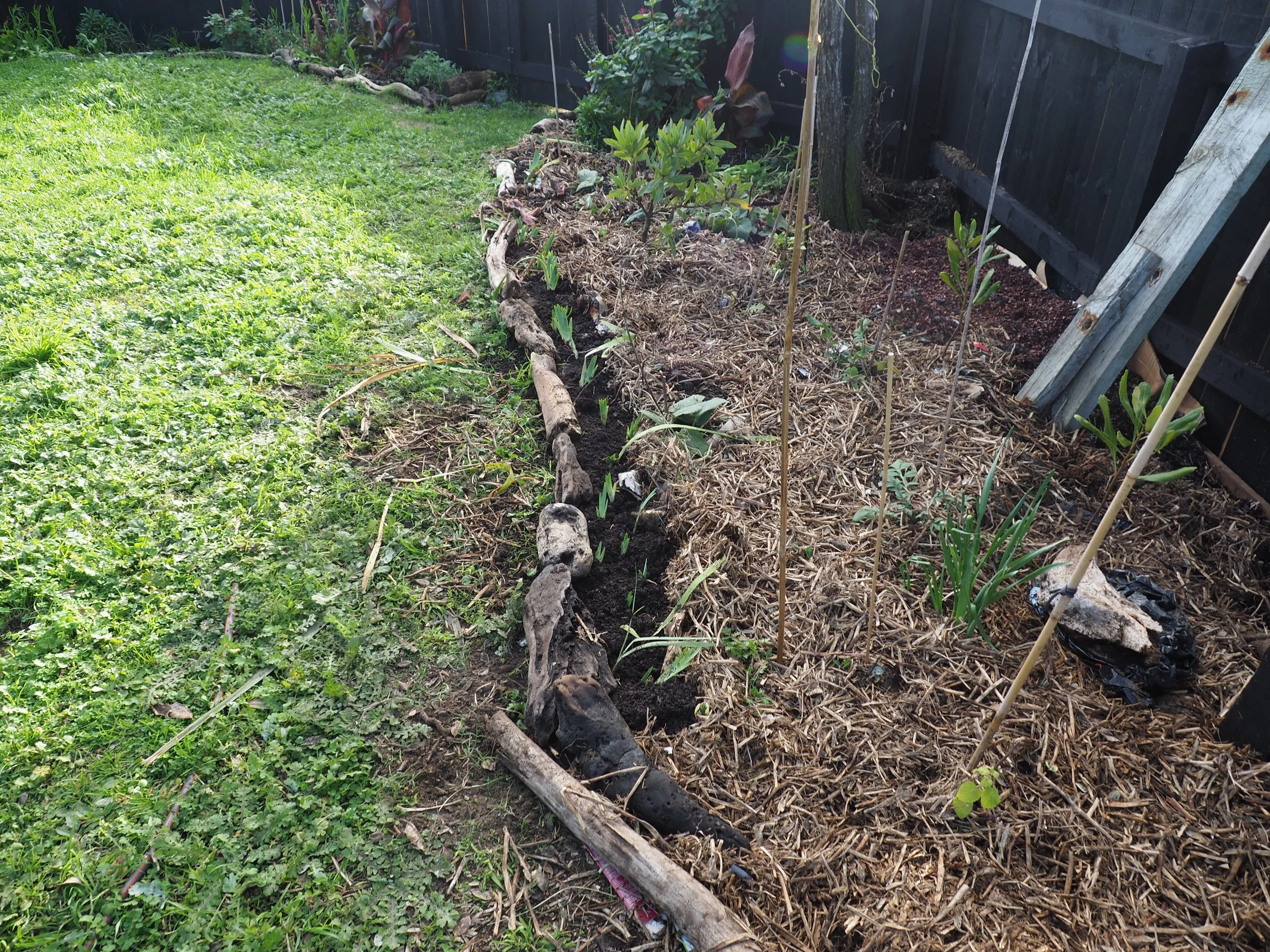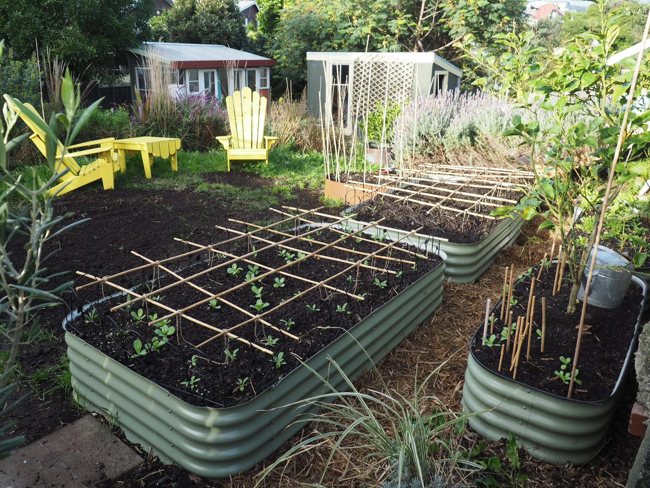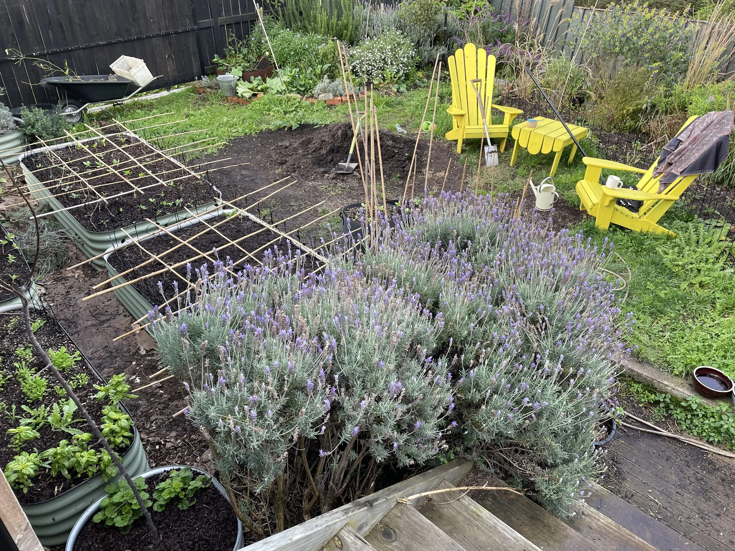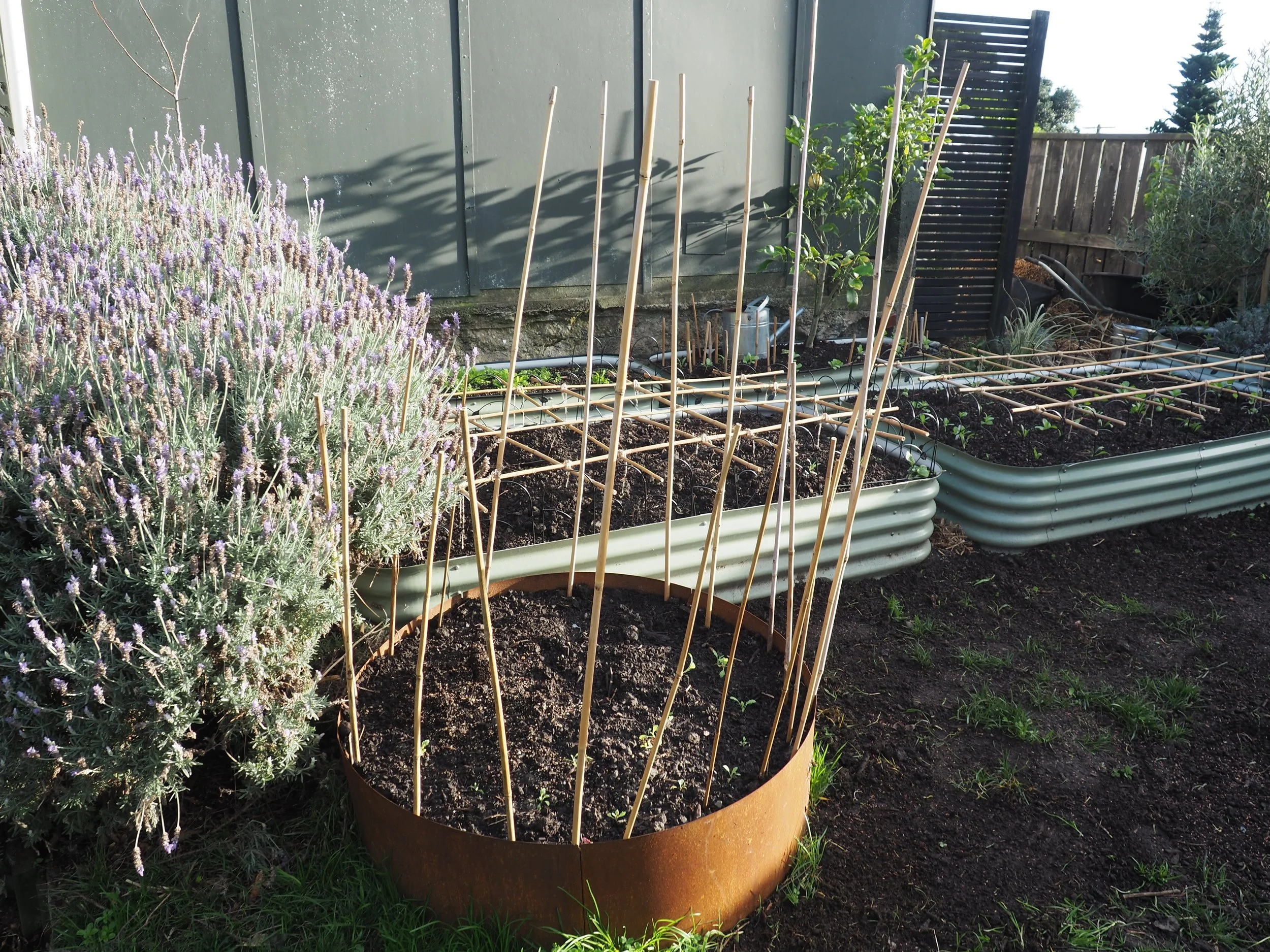 I was sick of the dogs jumping onto the raised beds so I made these frames out of string and bamboo. I trimmed the edges with loppers. They will double as growing supports for the flowers.