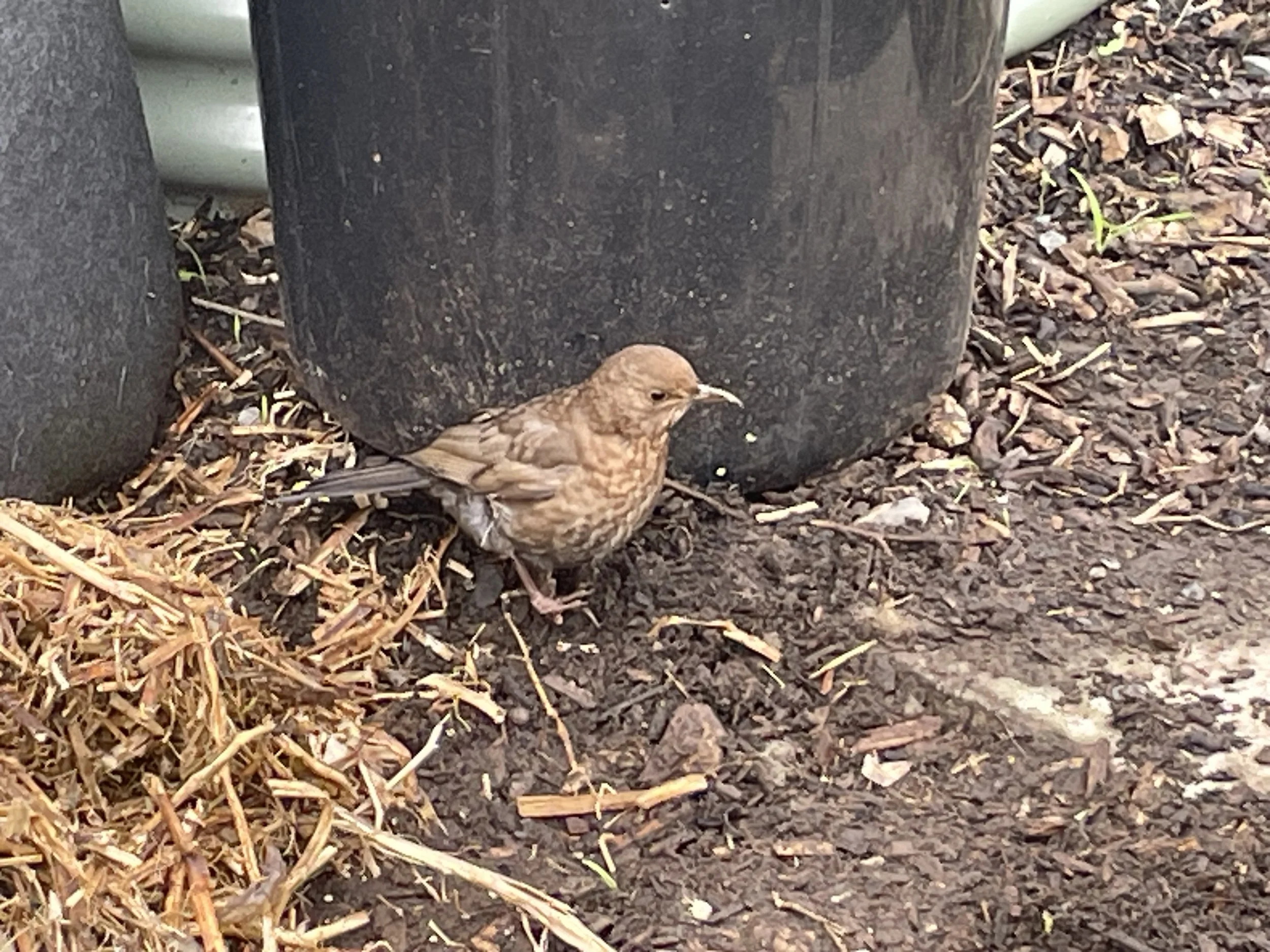 I spent all of Saturday in the back garden tidying it up. A brown bird followed me around, kicking up the pea straw and eating worms. The bird stayed with me all day and only flew to higher ground when the big dog chased it. The bird is very outgoing and not at all skittish. I think she/he was just having a laugh at the big dogs expense.