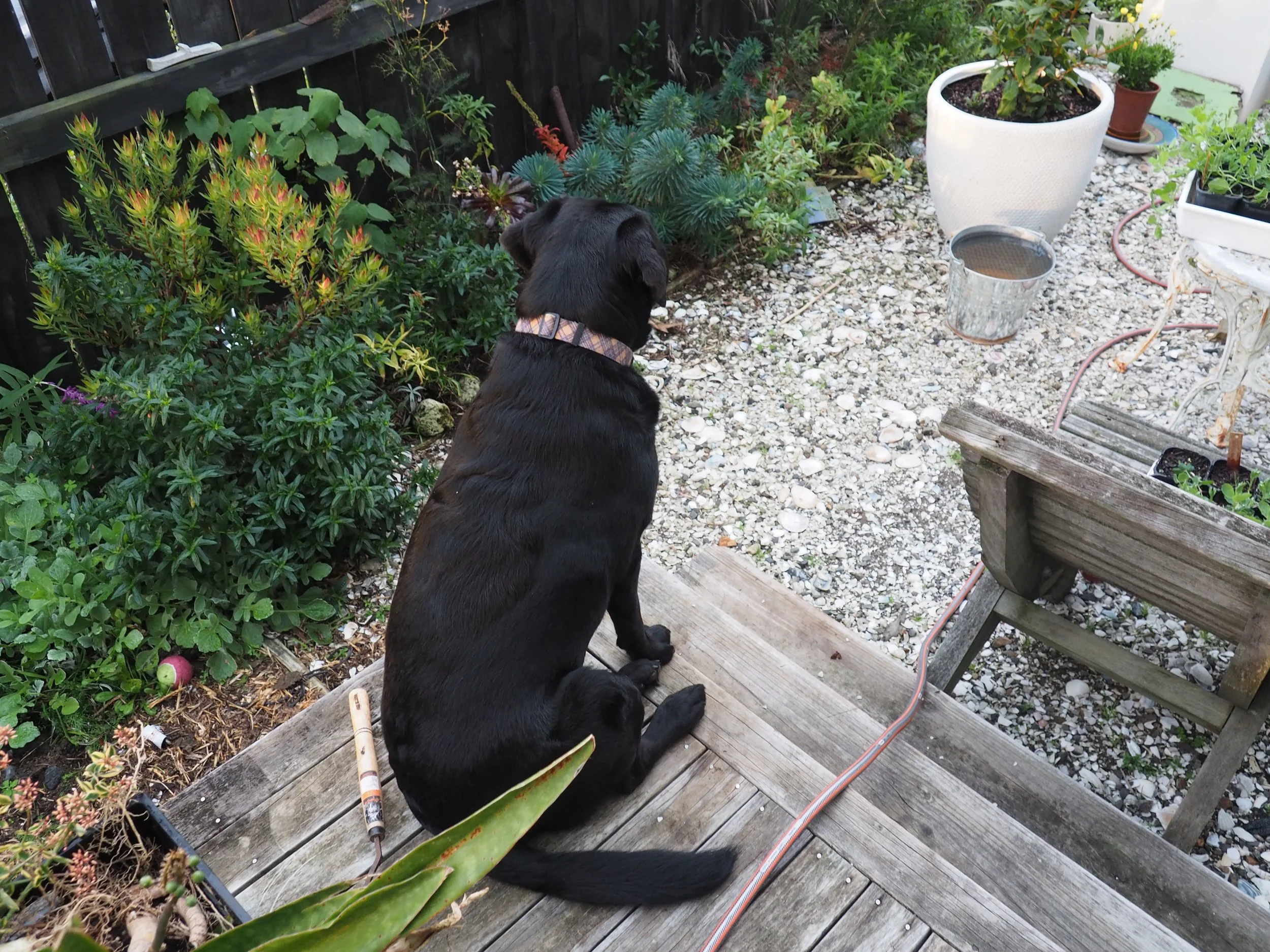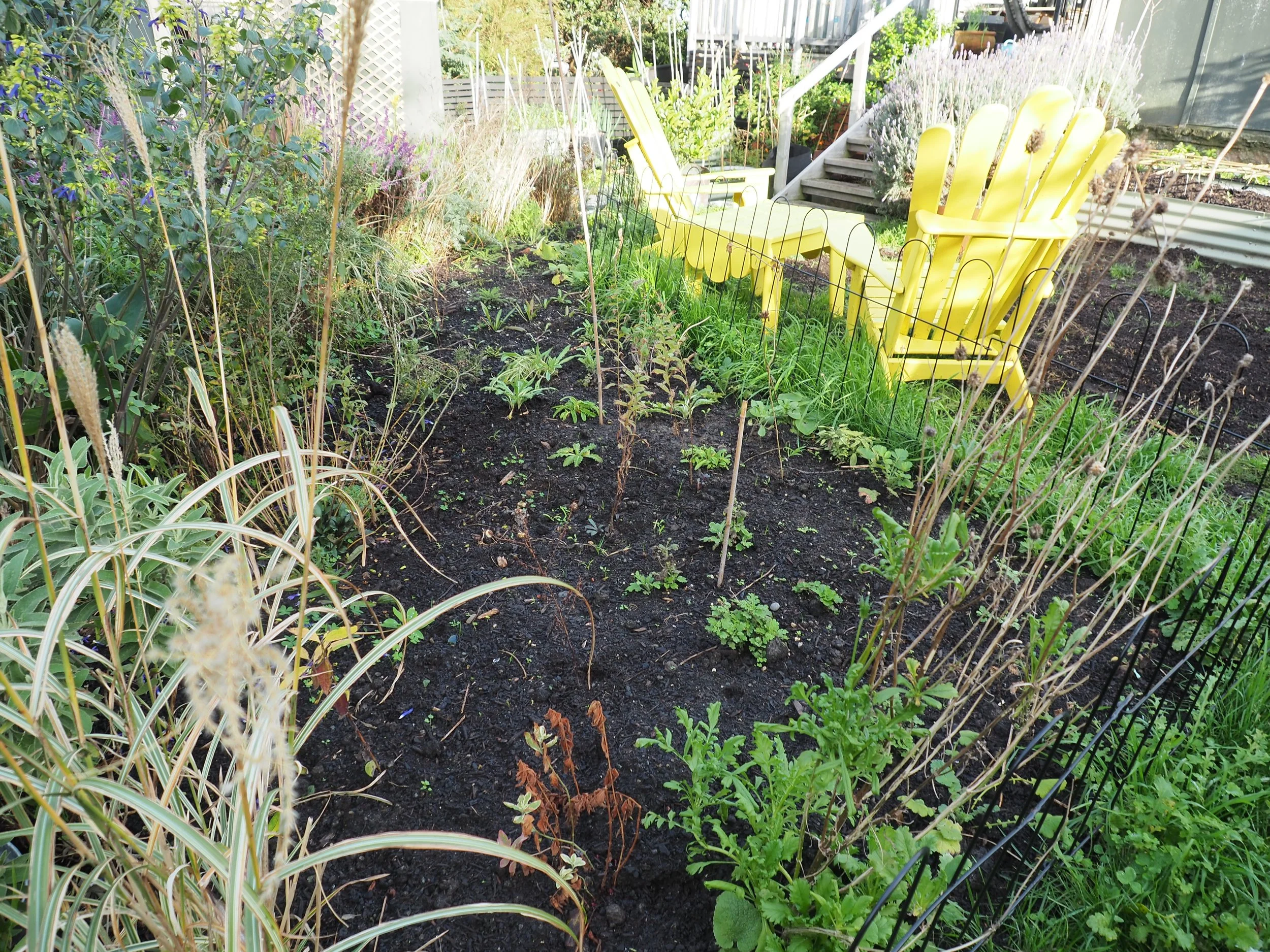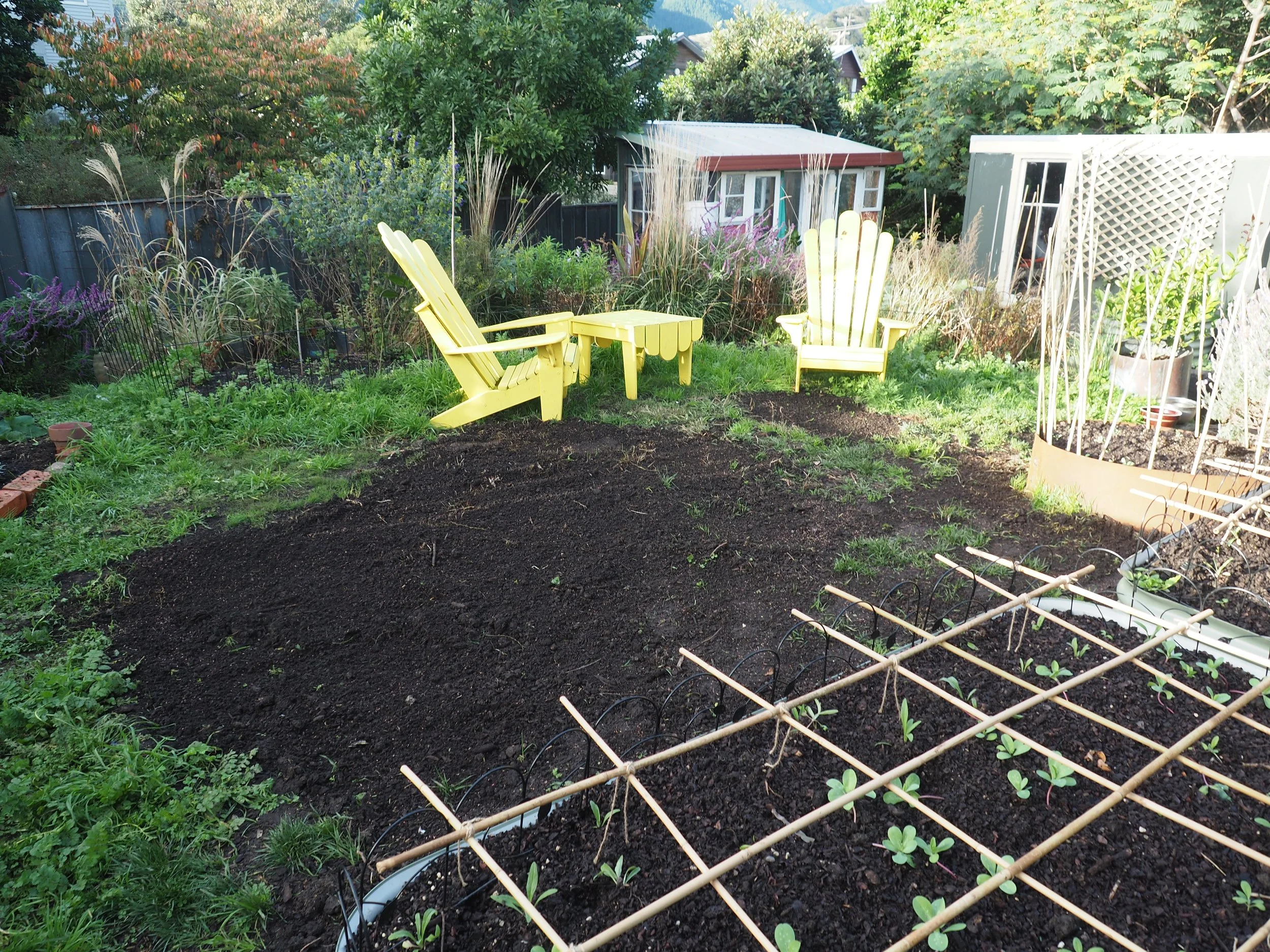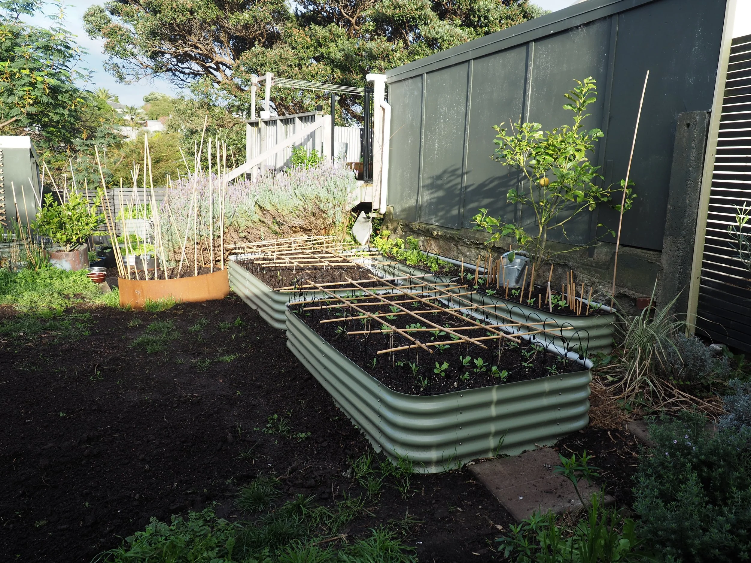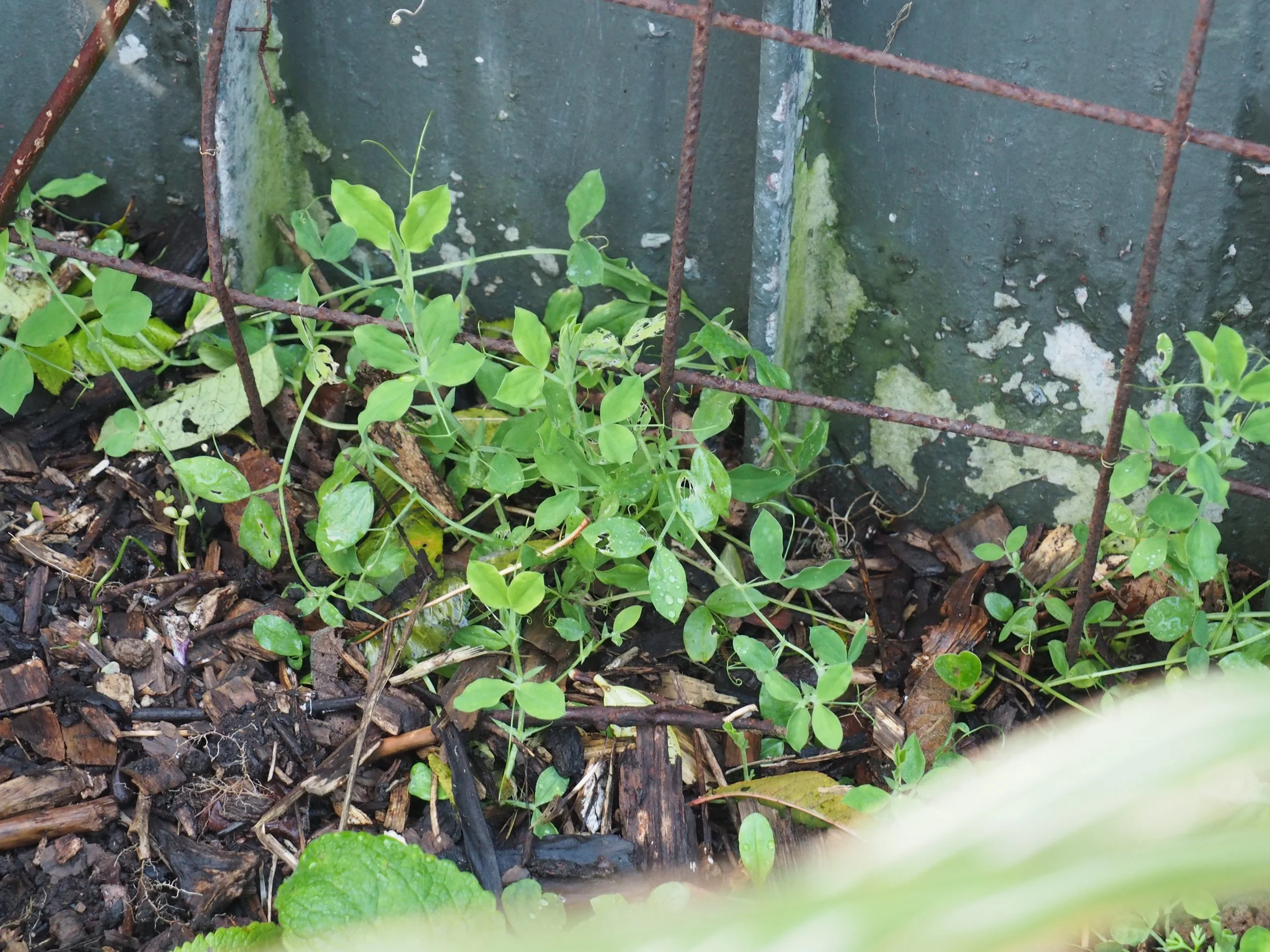 Here’s a forgotten corner. This is where I grew my heirloom sweet peas last summer. A good many of them have self-seeded and found their way up at the metal support. I bought the original seeds from Koanga Gardens. An old fashioned variety grown in New Zealand gardens for many generations. They have purple and magenta flowers and a rich scent.