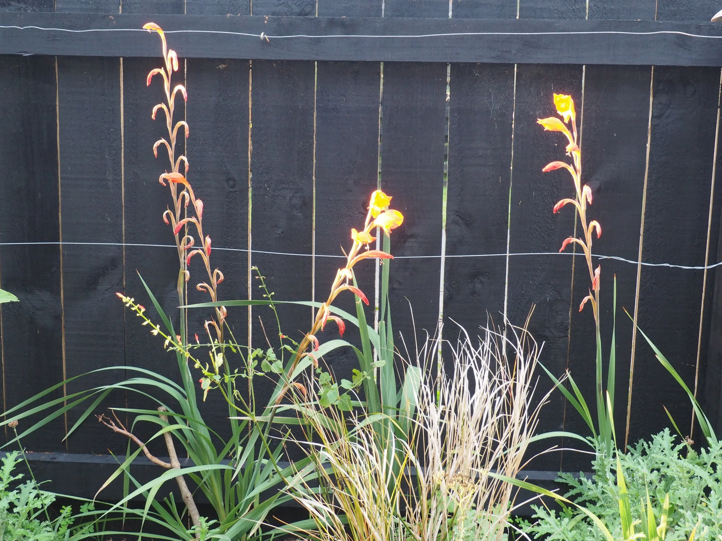 The glads are still flowering. I like this combination of plants: the glads, the grasses and a salvia with small orange flowers (that I transplanted from the Karori garden).