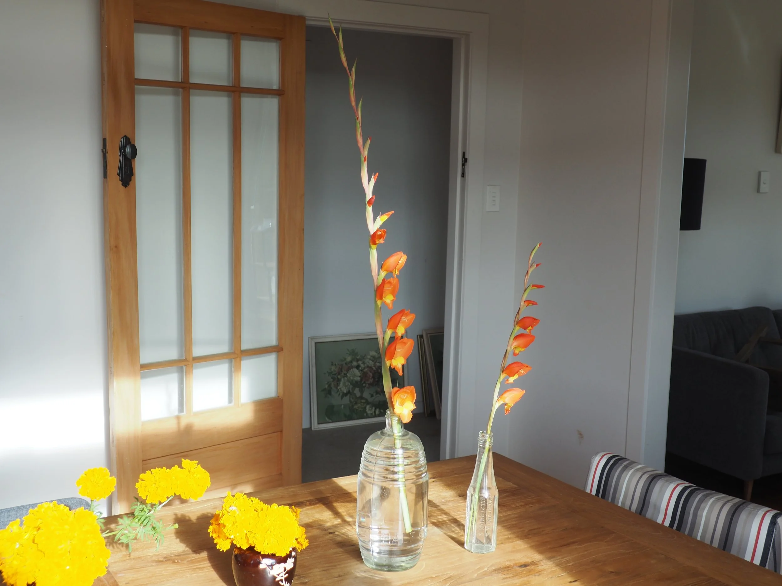 Last week I wrote about this mystery flower that appeared in different parts of the Paekekariki garden. I thought it was Watsonia. My neighbour reckoned it was gladiolus. Then my friend Ali sent me a photo of some gladiolus flowers in a vase. I’d given her the bulbs a couple of years back. It turns out they’re the same flower. The same orange flowers with the yellow throats. Gladiolus natalensis to be exact.