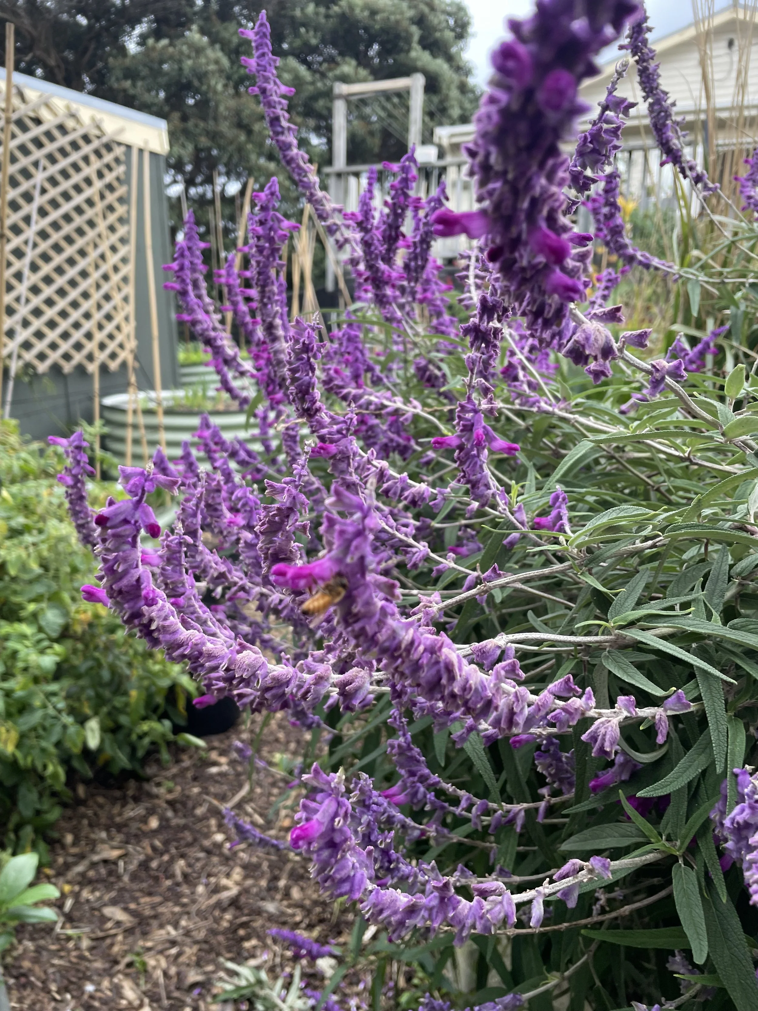 I got stung by a bee last Sunday. It wasn’t the bee’s fault. I haven’t been stung by a bee since I was kid running around barefoot. I have a large salvia bush that leans over the narrow path to the greenhouse. I have to brush against the bush to get there. A honeybee got a fright and stung my arm. Once winter arrives I’ll move the salvia to the front garden. I’ve discovered that this salvia makes a great cut flower if you pick it at the right time. The right time being before the flowers come out. The wrong time isn’t such a wrong time. You still get lovely long stems twisting in all sorts of interesting directions. You get a carpet of purple around the vase as the flowers drop off the stems.